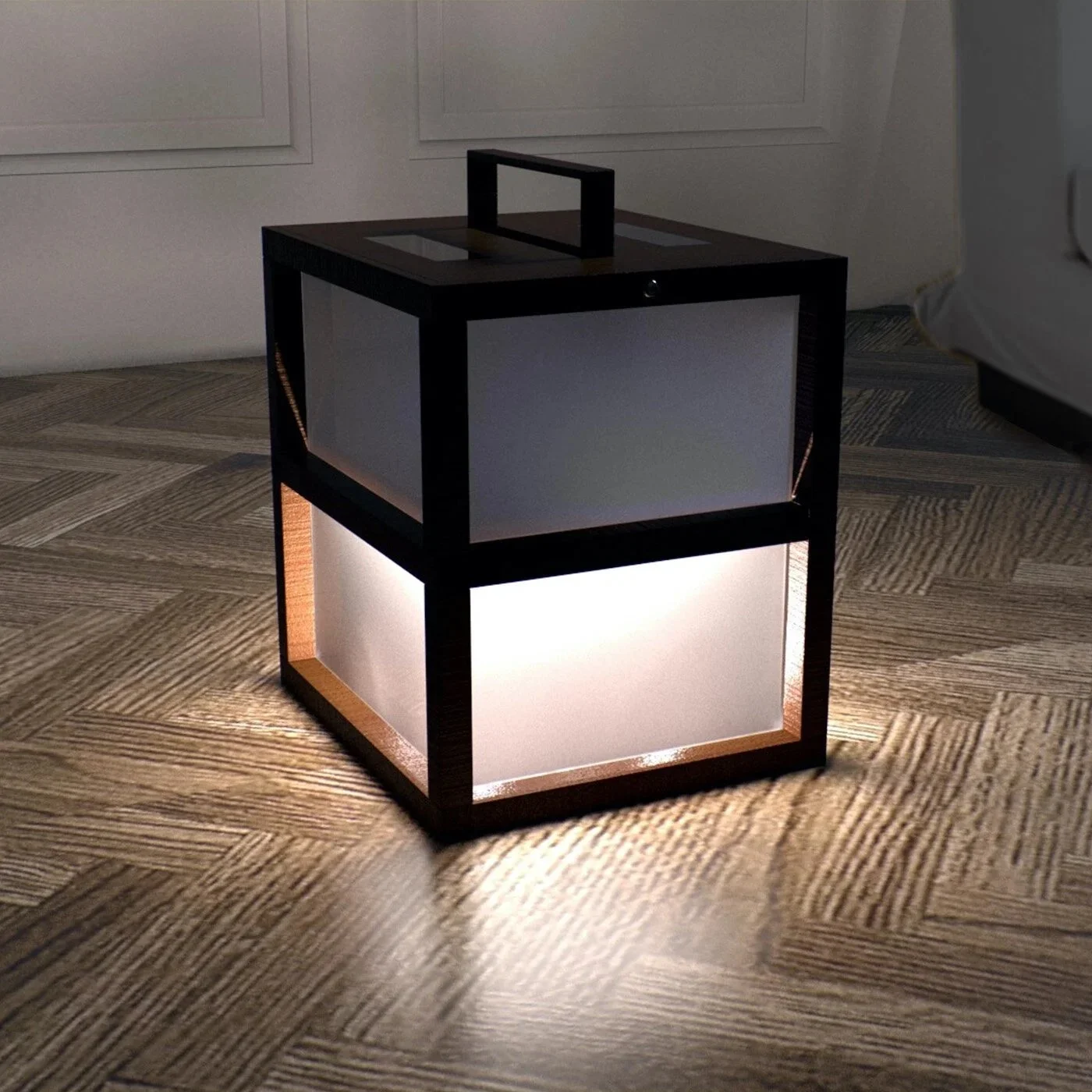 Three lamps set designed for interior lighting, powered by solar energy, captured thanks to solar panels located on the top of each one. They all have a light division and are stackable according to the user's needs.
