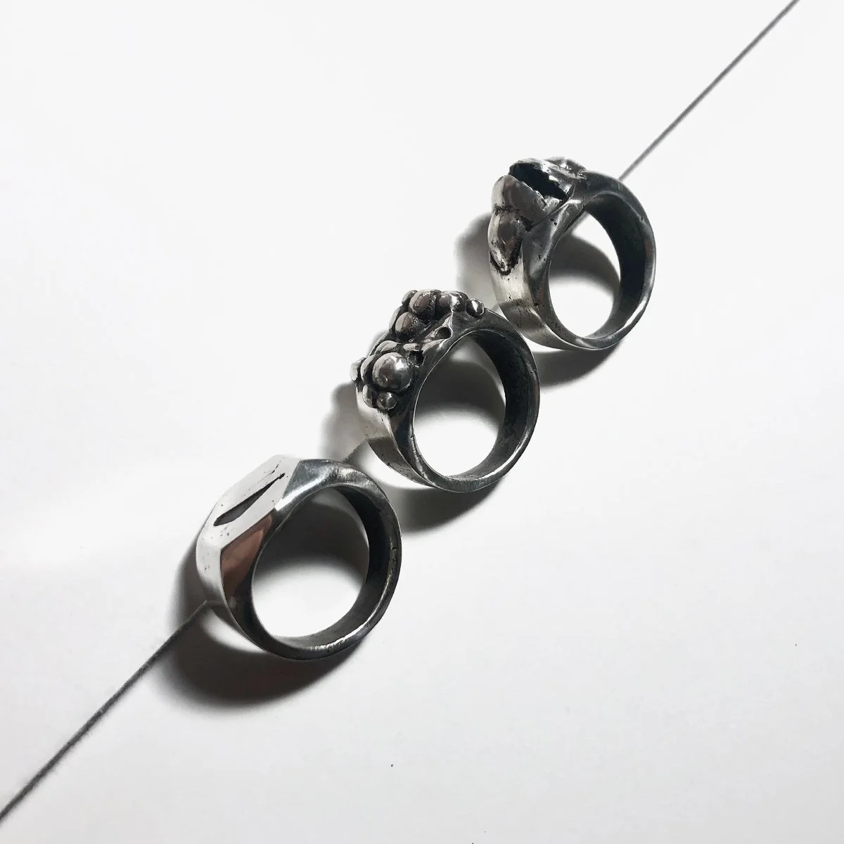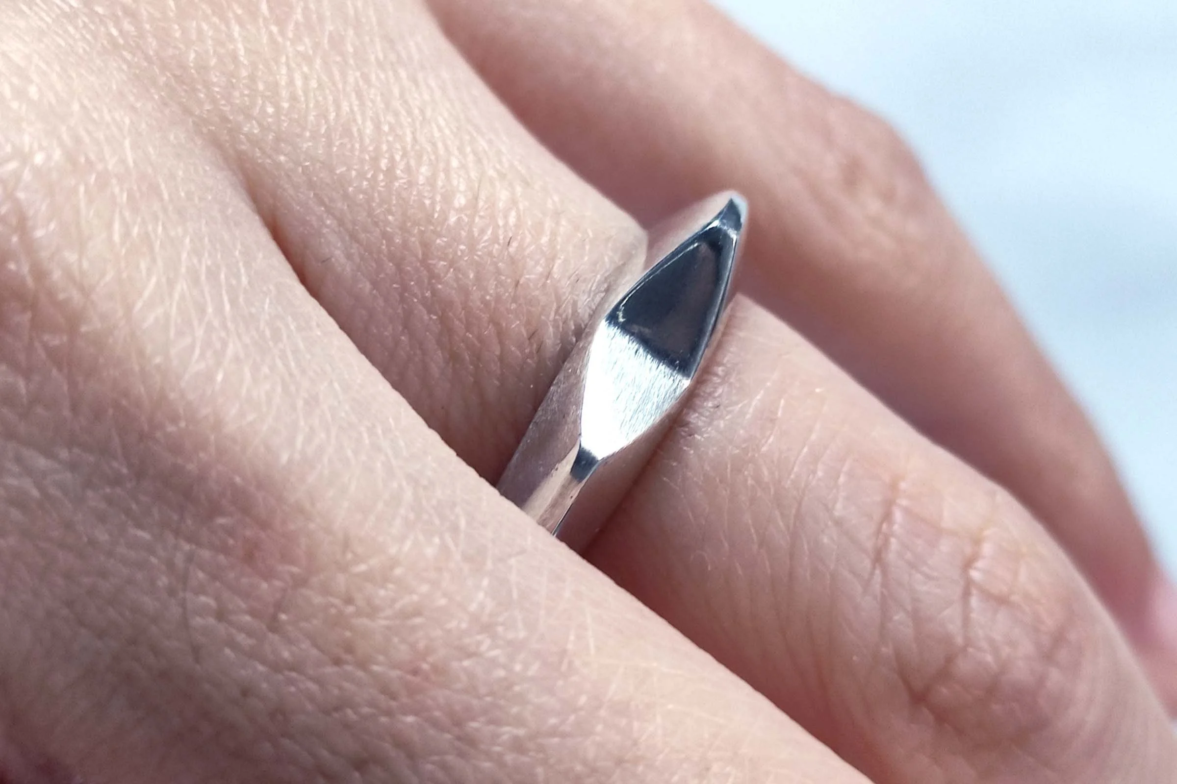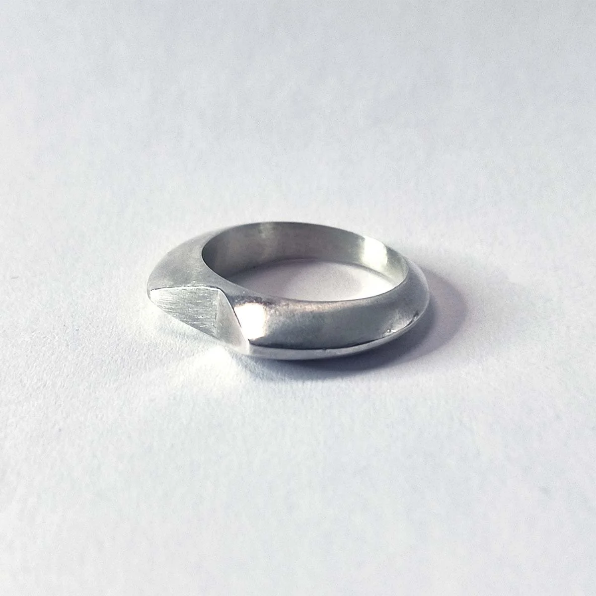 Although things look incomplete, they really are not, we just have to change our perspective. Incomplete plays with the silhouette and views of the ring giving two perspectives (top and side). Ring modeled in wax and cast in silver