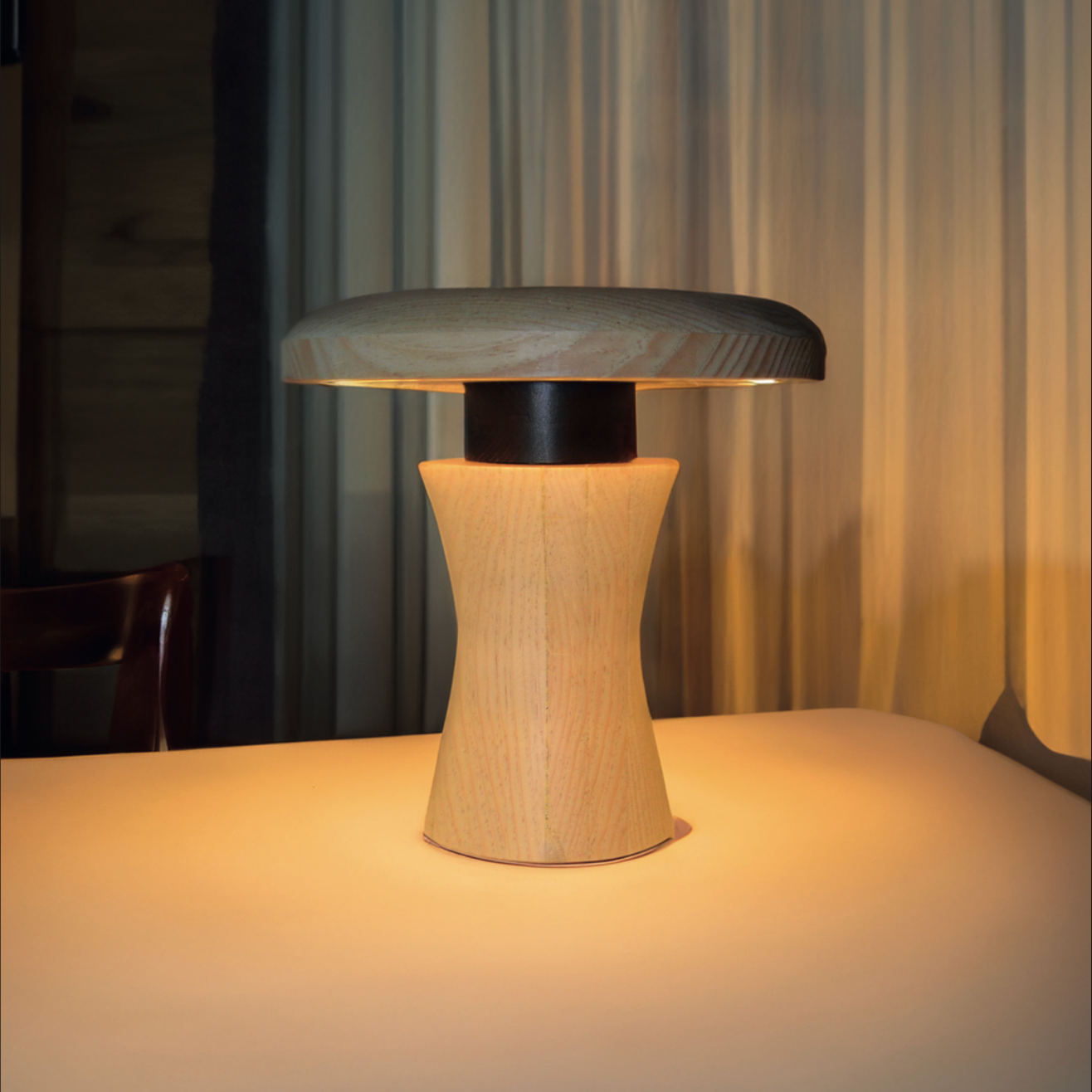 Cone-shaped lamp crafted from pine wood. Its conical design is complemented by an adjustable mobility that allows directing the beam of light in various directions, providing versatility in lighting.