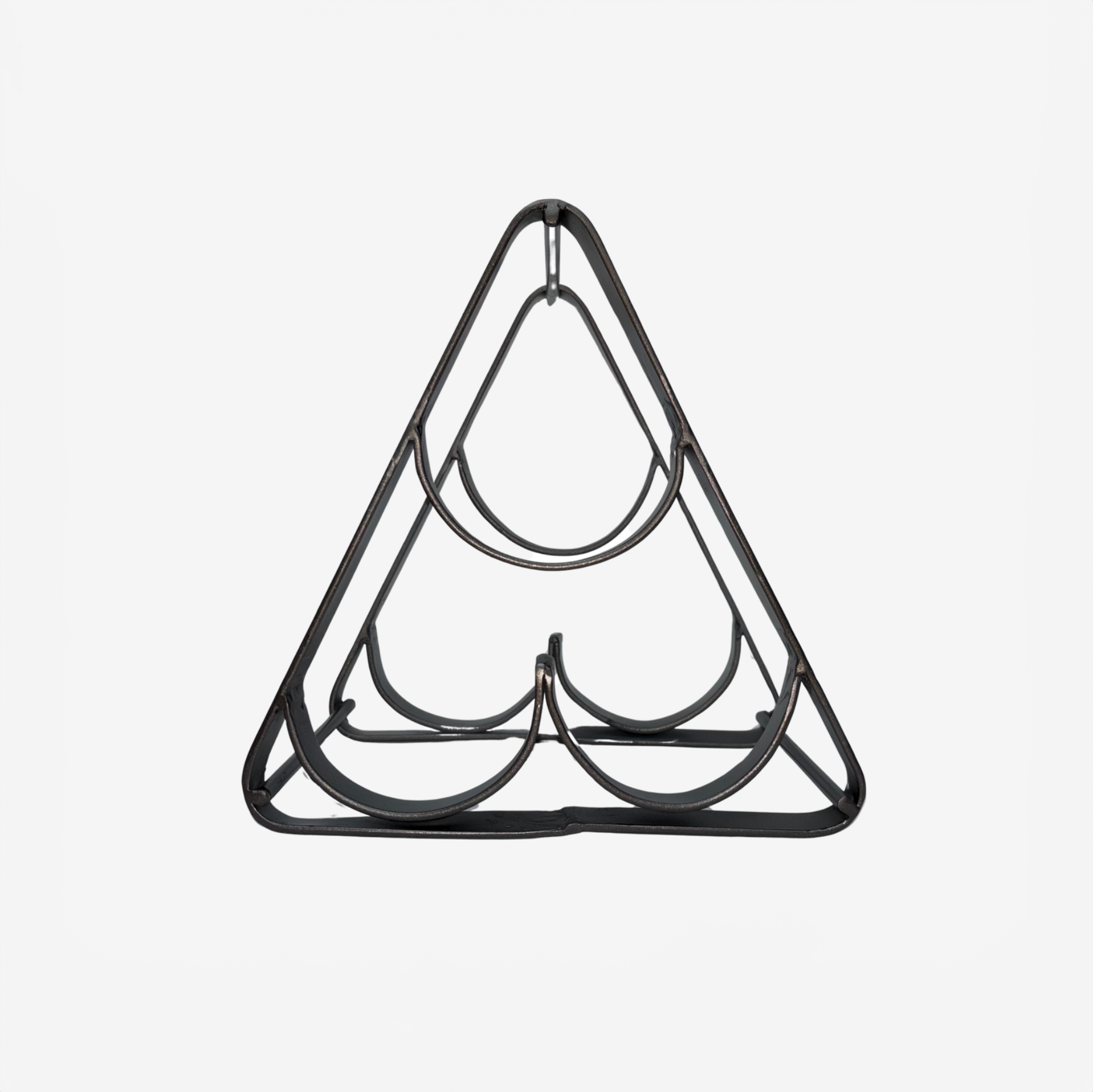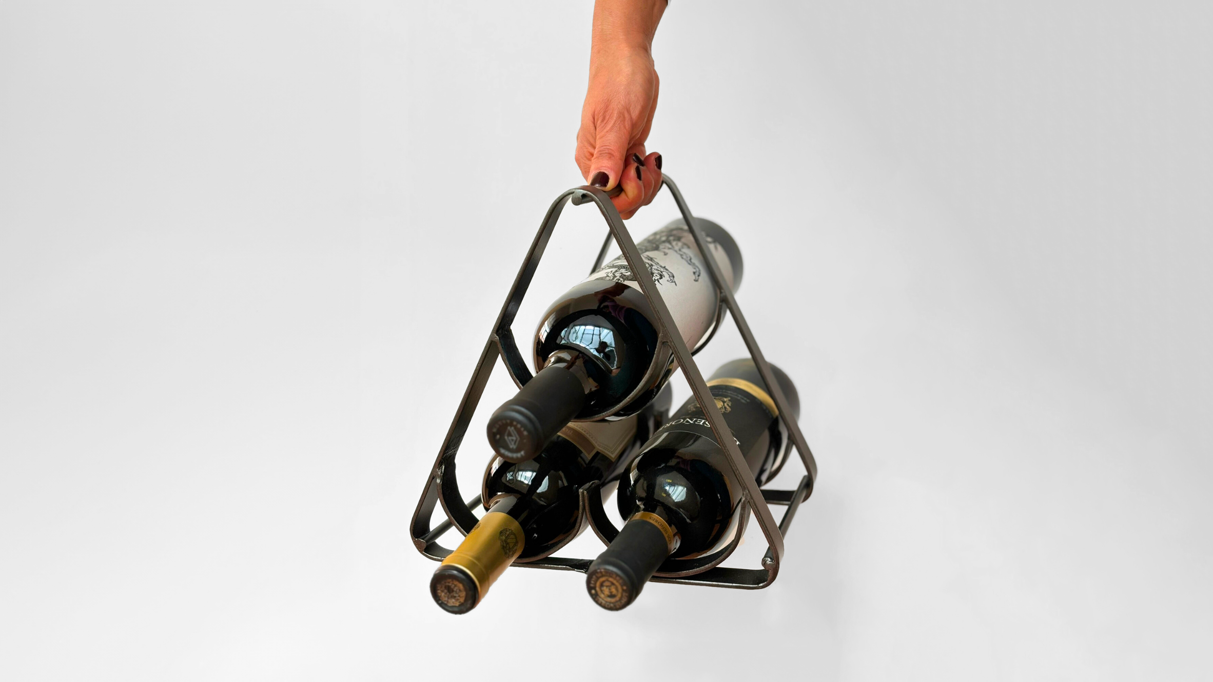 Wine cellar made of metal and carbon steel. It holds up to 3 wine bottles and allows to be carried.