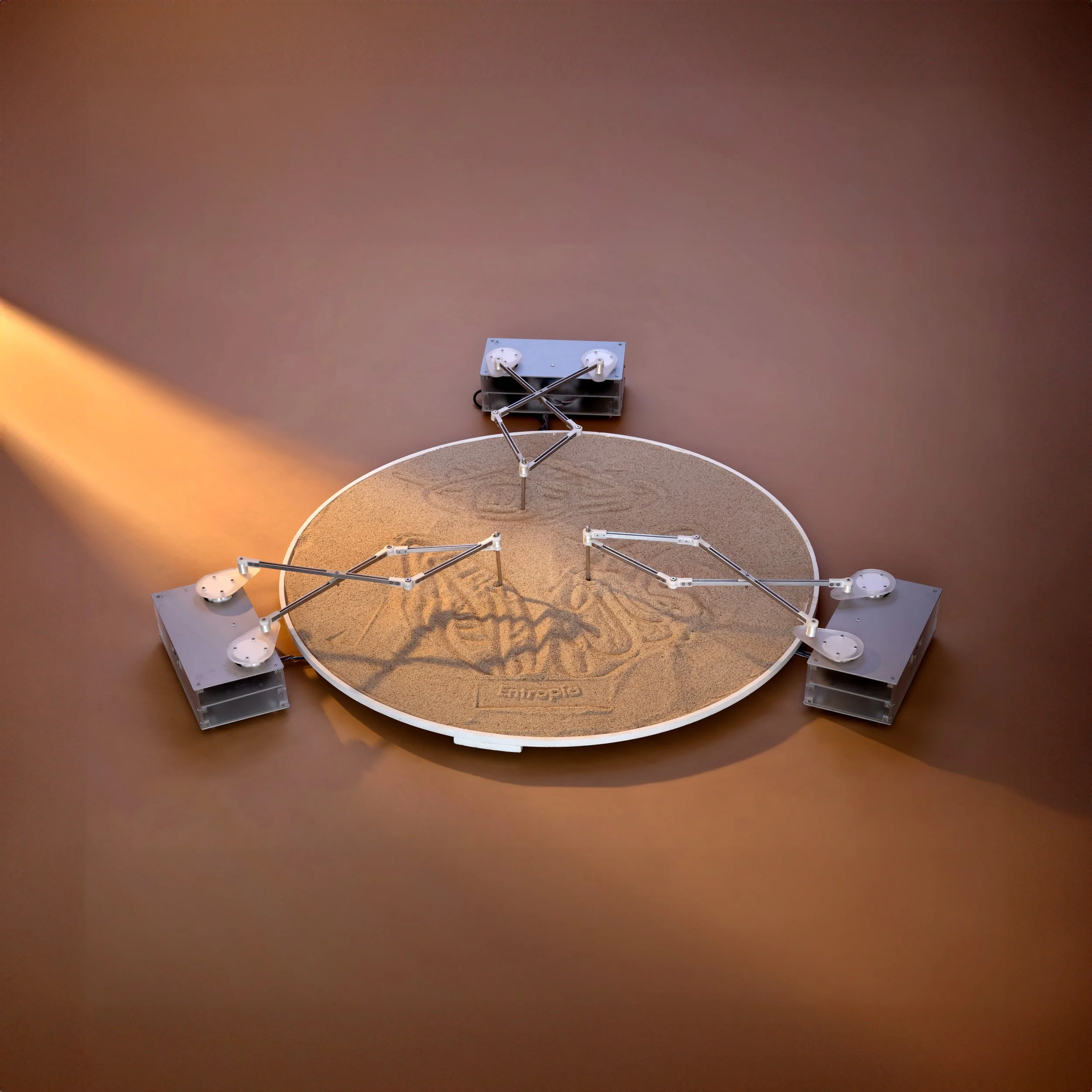 Entropía (Entropy) is a machine generating patterns through human interaction, symbolizing the chaos in migrant life. It operates in three stages: a constant pattern (order), human interaction (trigger), and the resulting chaos (loss of routine).
